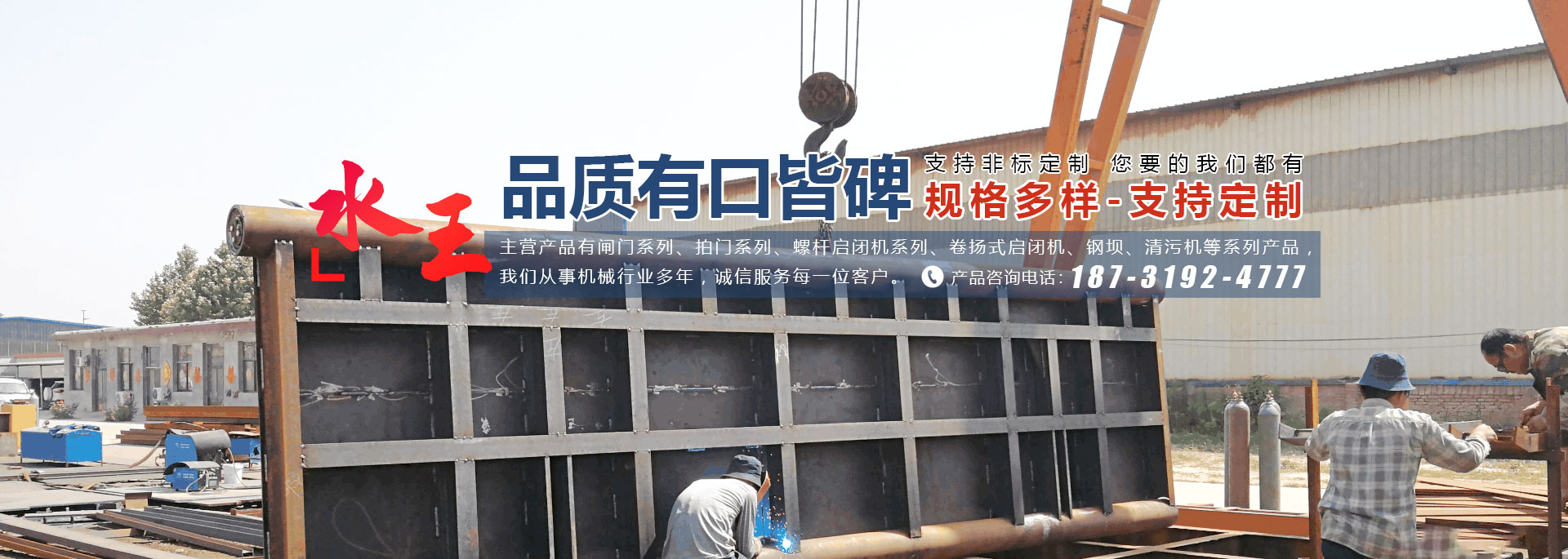 河北水王水利機械有限公司專業生產銷售鑄鐵閘門、啟閉機、閘門、固定卷揚啟閉機、移動卷揚啟閉機、電裝啟閉機、鑄鐵鑲銅閘門、鋼制閘門、翻板閘門、不銹鋼閘門、景觀壩、鋼壩、液壓翻板閘門、鑄鐵拍門、鋼制拍門等各種材質拍門、橡膠止水的專業制造、生產及指導安裝的綜合性廠家,具有現代化管理模式,產品結構合理,性能可靠,確保向客戶提供高質量的產品和周到的售后服務,是制造、銷售、安裝一體化的規模型水利工程機械生產企業。  主導產品:  1、螺桿式啟閉···